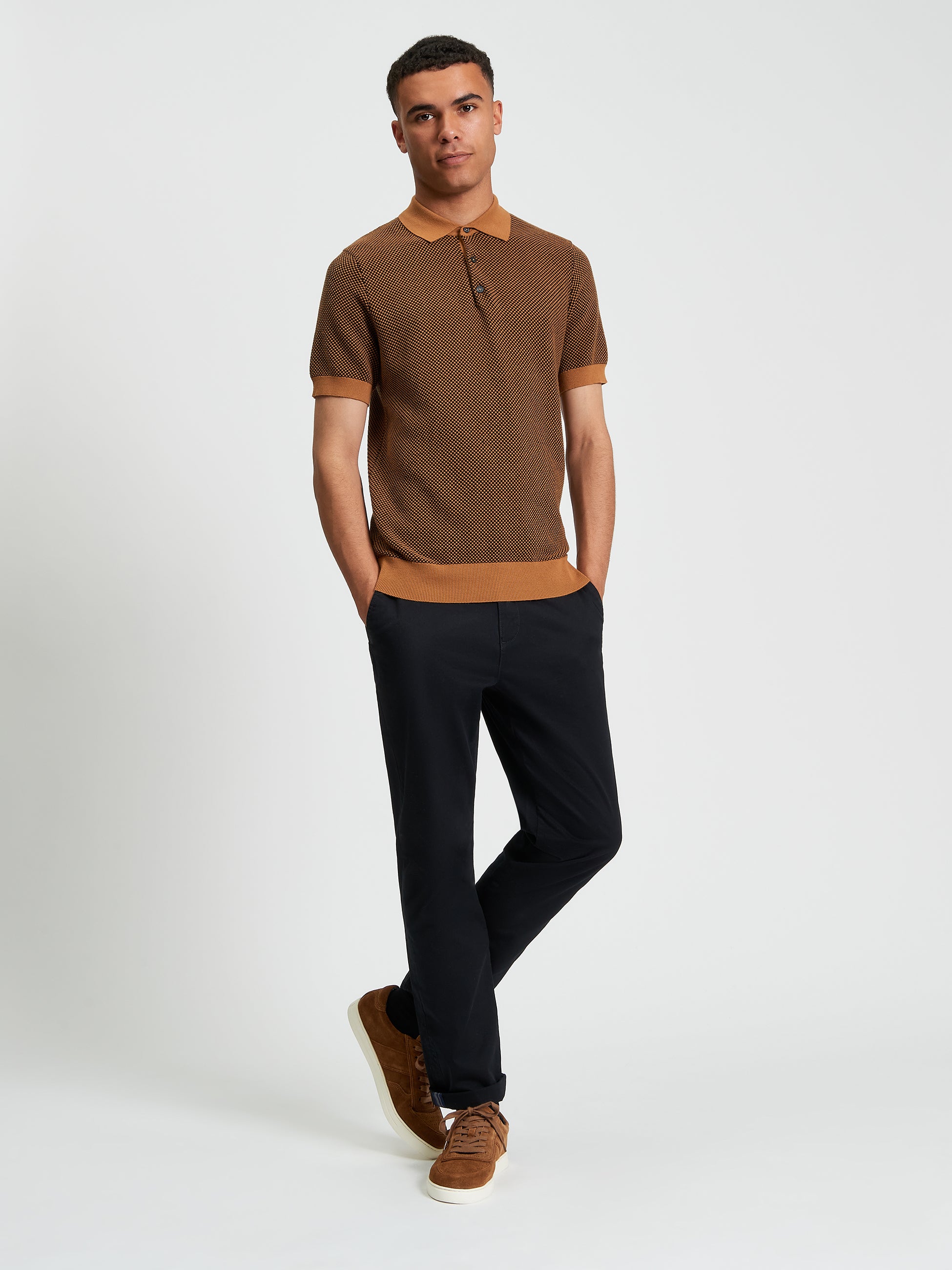 Made from 100% cotton, this regular-fit short sleeve knitted polo stands out with its bi-coloured textured design. The classic three-button placket adds versatility, while the Ben Sherman branded woven label on the side seam delivers a subtle signature finish. A refined take on a timeless staple.