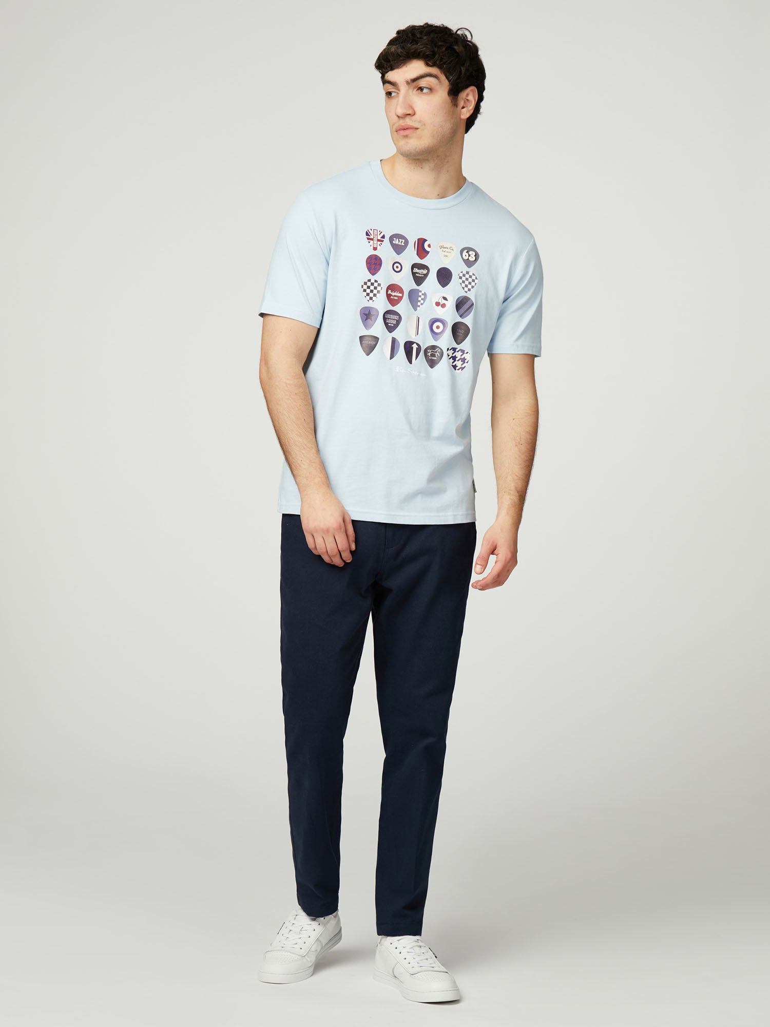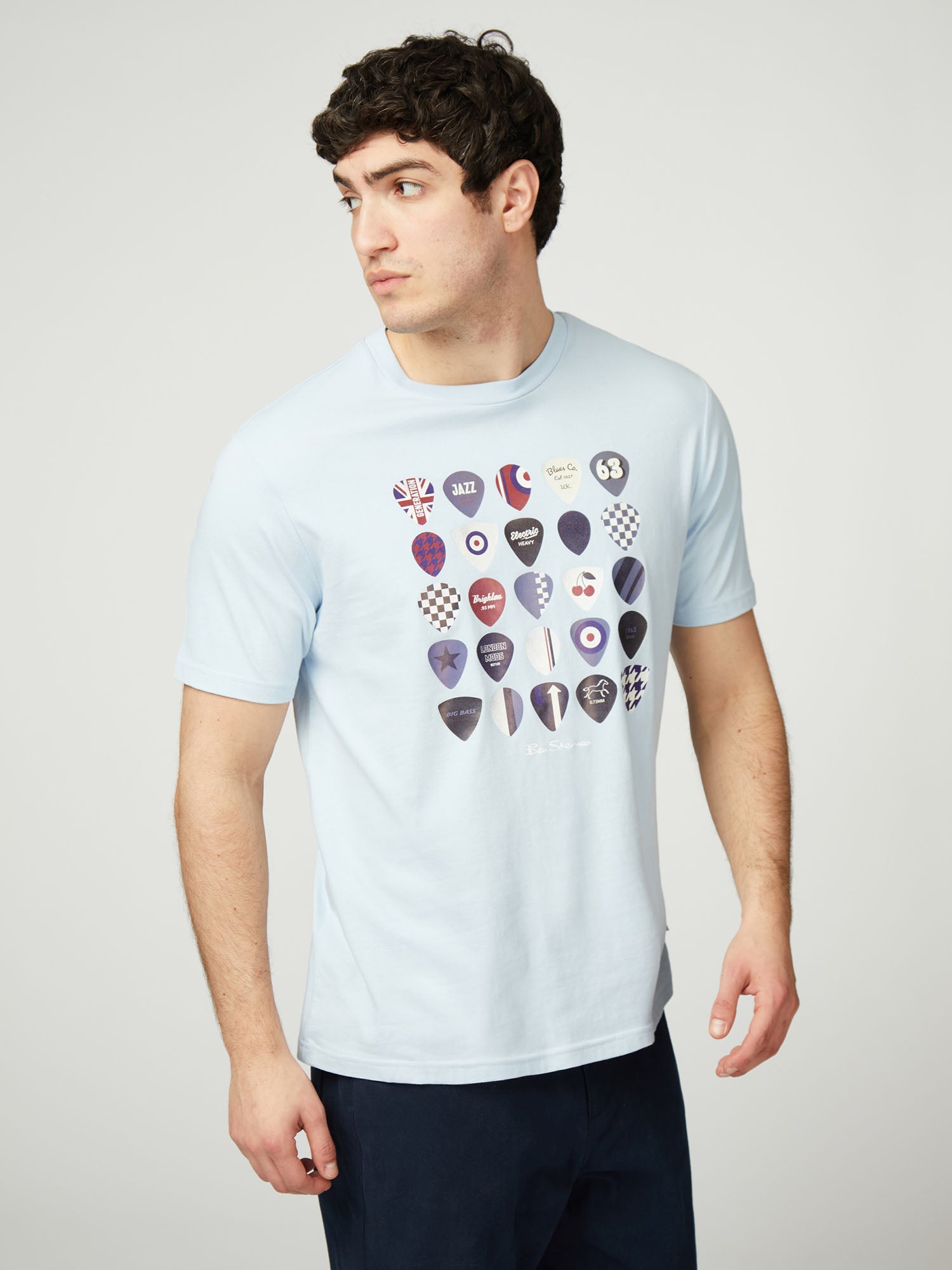 100% organic cotton graphic tee in a regular fit. This t-shirt features a guitar plectrum photographic chest print. This style is complete with a 'Ben Sherman' flag label.