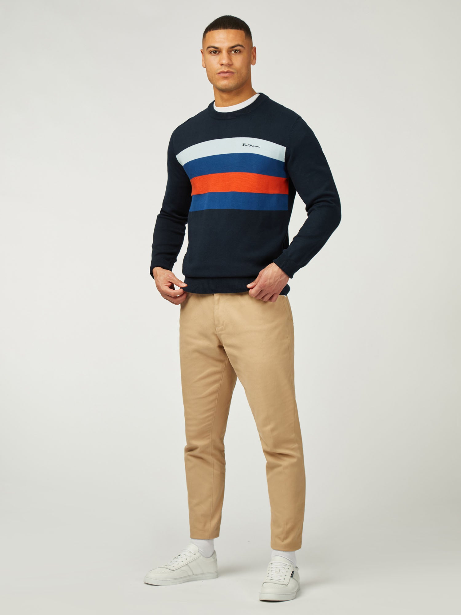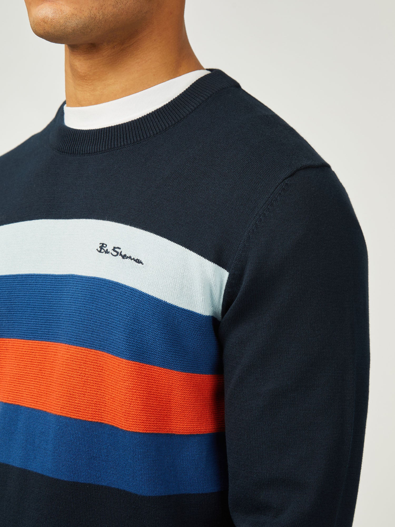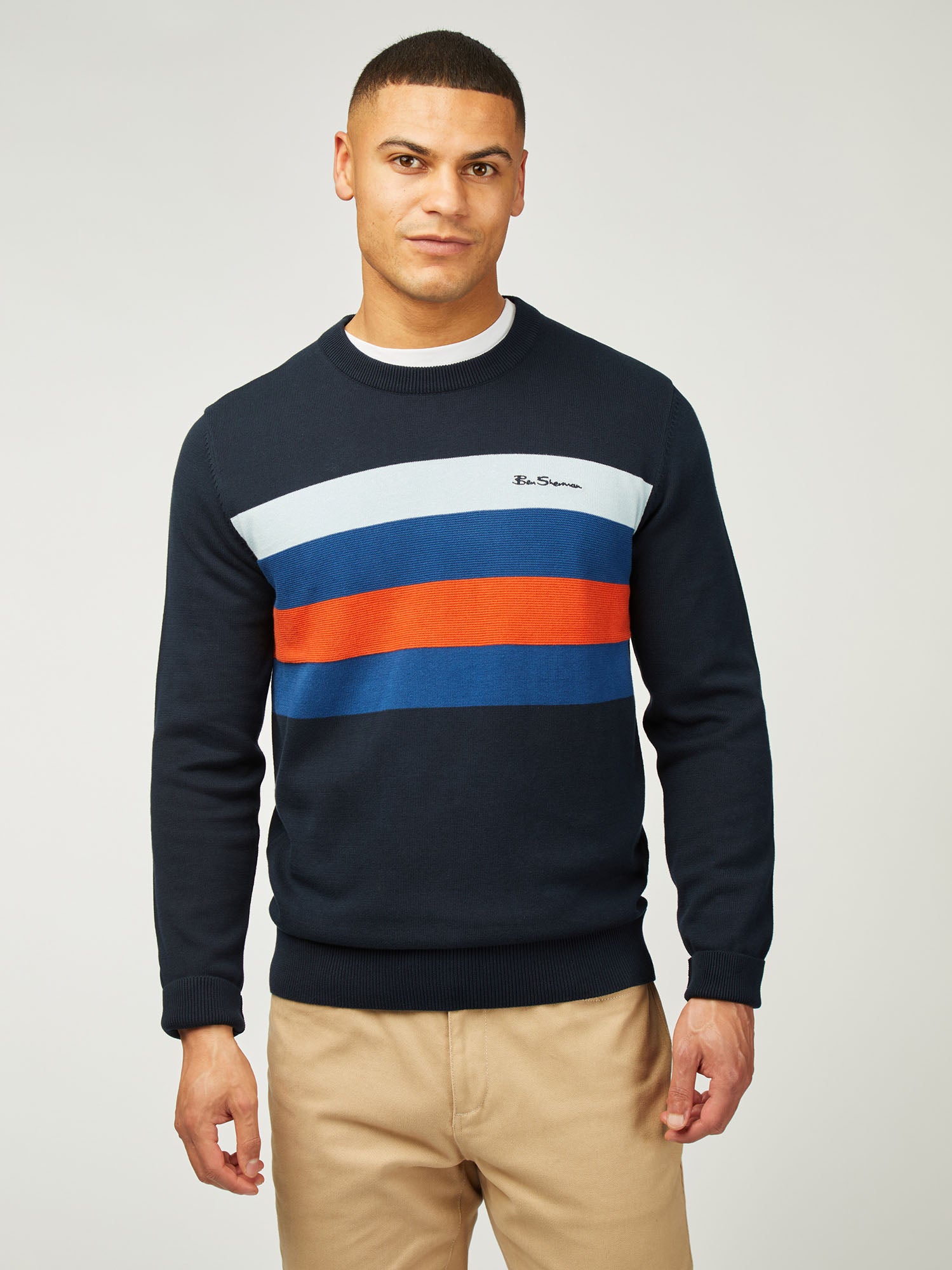 Made from 100% organic cotton, this knitted chest stripe crew features textured stripes and a ‘Ben Sherman’ embroidery on the left chest.